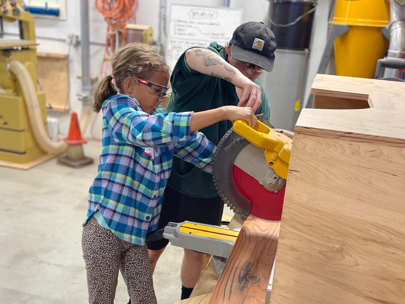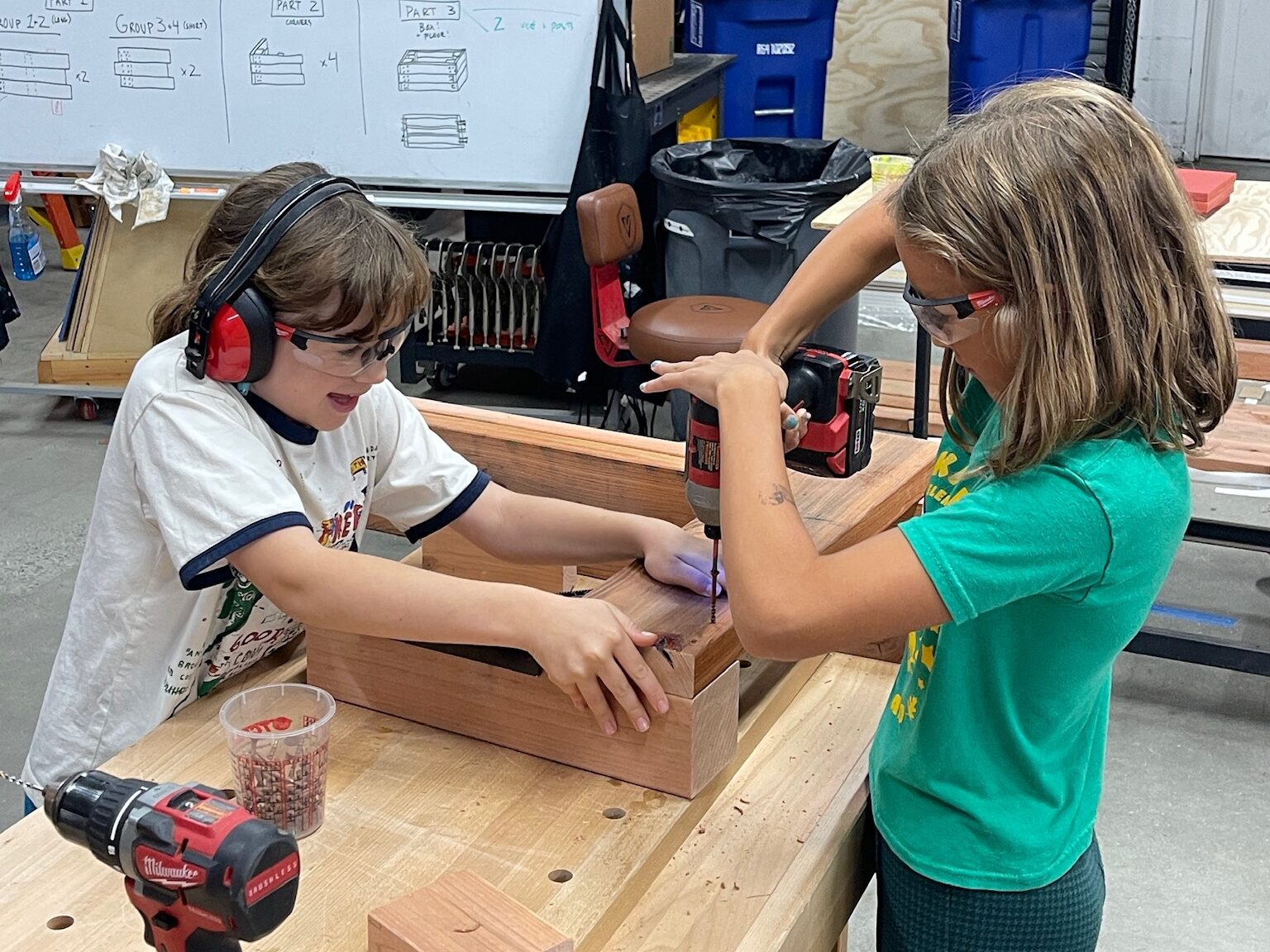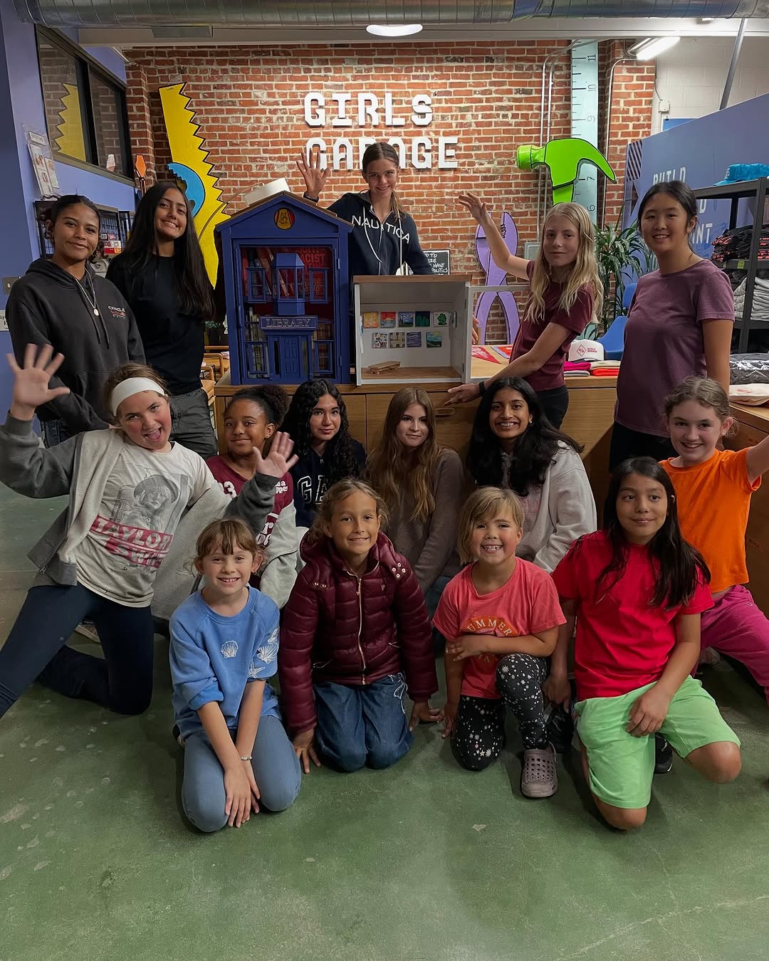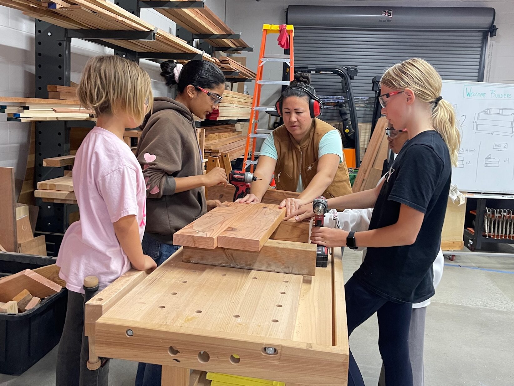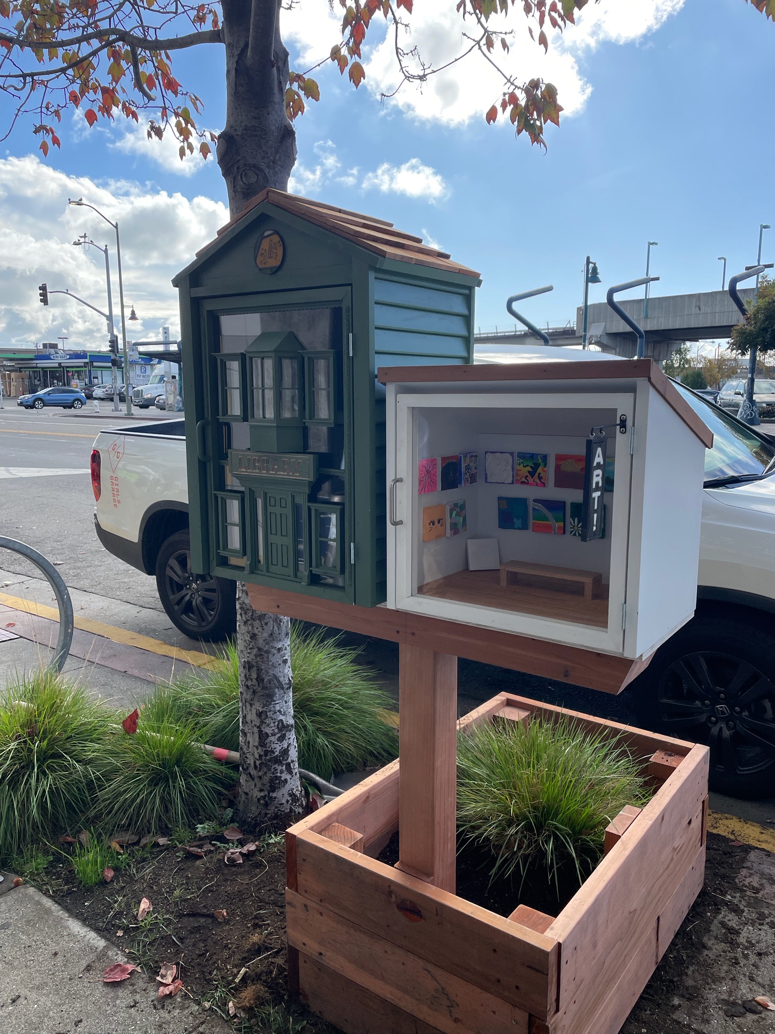 For our youngest students, we often work on take-home projects to develop their skills. This fall, we worked on two dual little free library AND little free art gallery that lives in a planter box outside of Mandela Grocery in West Oakland. On the last day of class, we filled teeny canvases with art, packed nail holes with wood filler, added another layer of exterior paint to the siding, and built mini furniture for the gallery. Taking care of these little details took this project to the next level. We can’t get enough of the delightful elements here: the tiny stained glass window by Kerbi Urbanowski, the hardwood flooring in the art gallery, the roofing and siding, and all the handmade artwork by our students.