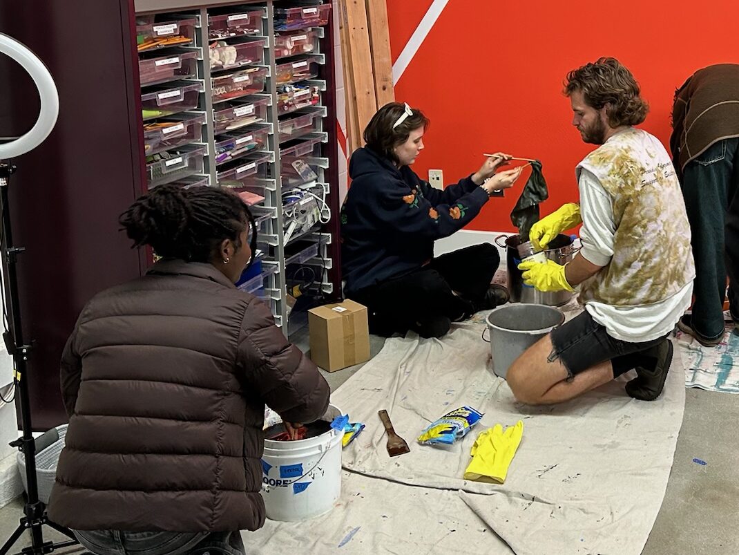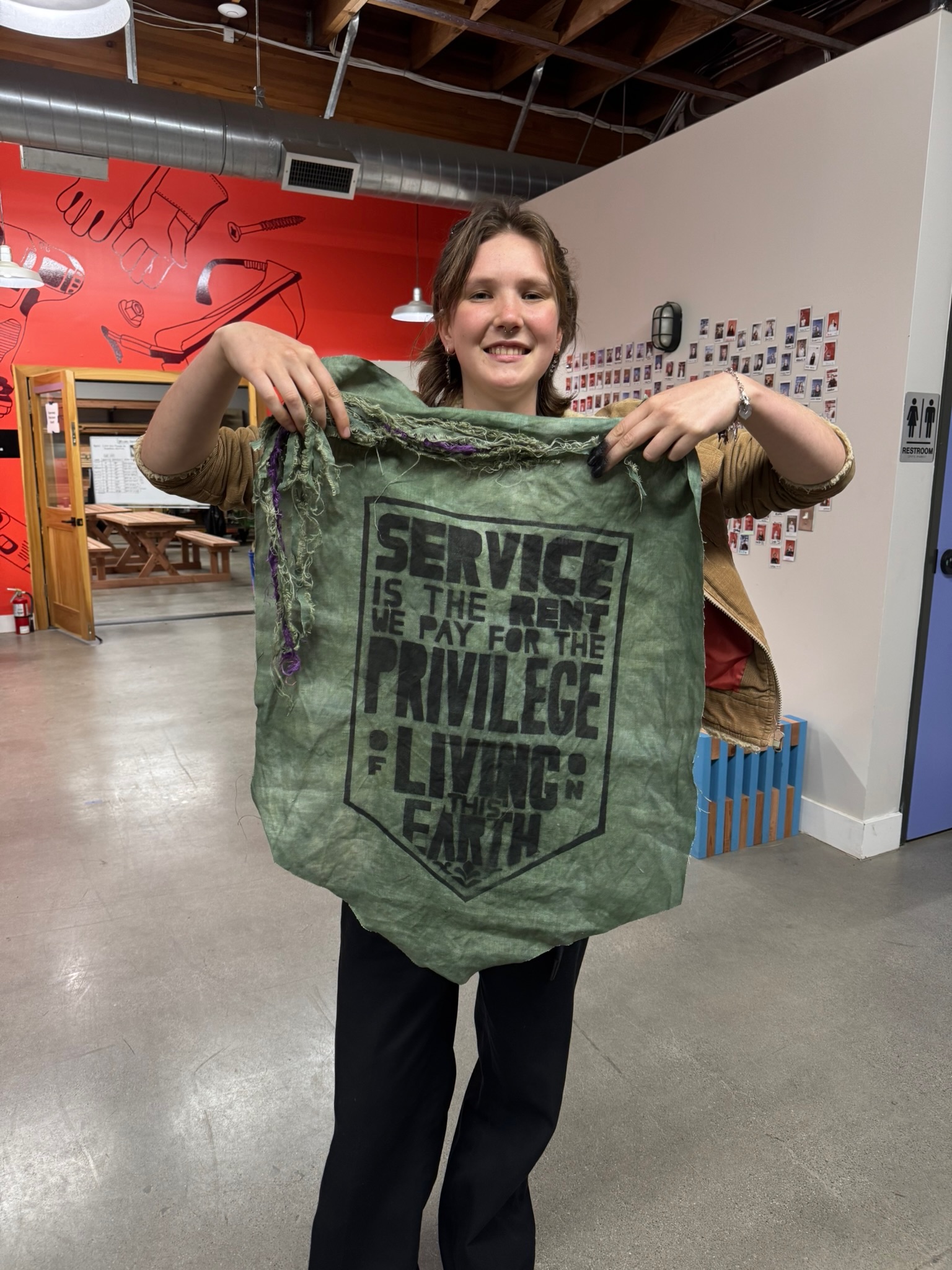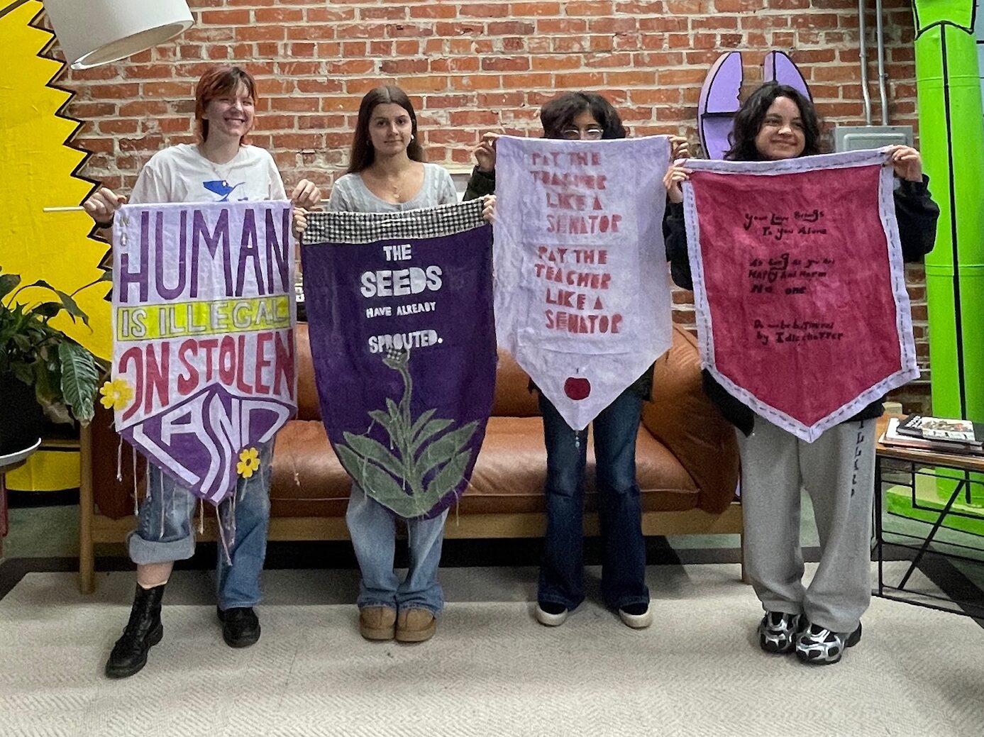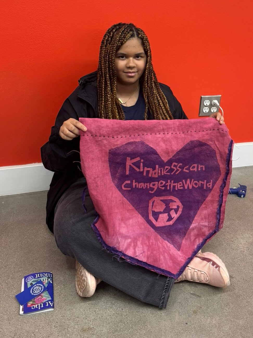 With the guidance of guest teaching artist Cordy Joan and support from seasoned Girls Garage instructor Alex Bowman, our young artists delved into the world of textile arts by crafting pennant banners. They received a crash course in fabric dyeing, sewing, weaving, embroidery, and much more in six weeks. After hand-dyeing natural fabrics using soda ash to help permanently bond colors to the fibers, students cut stencils out of file folders, spray painted text, and added embroidered details, including text, florals, and ornate borders.
