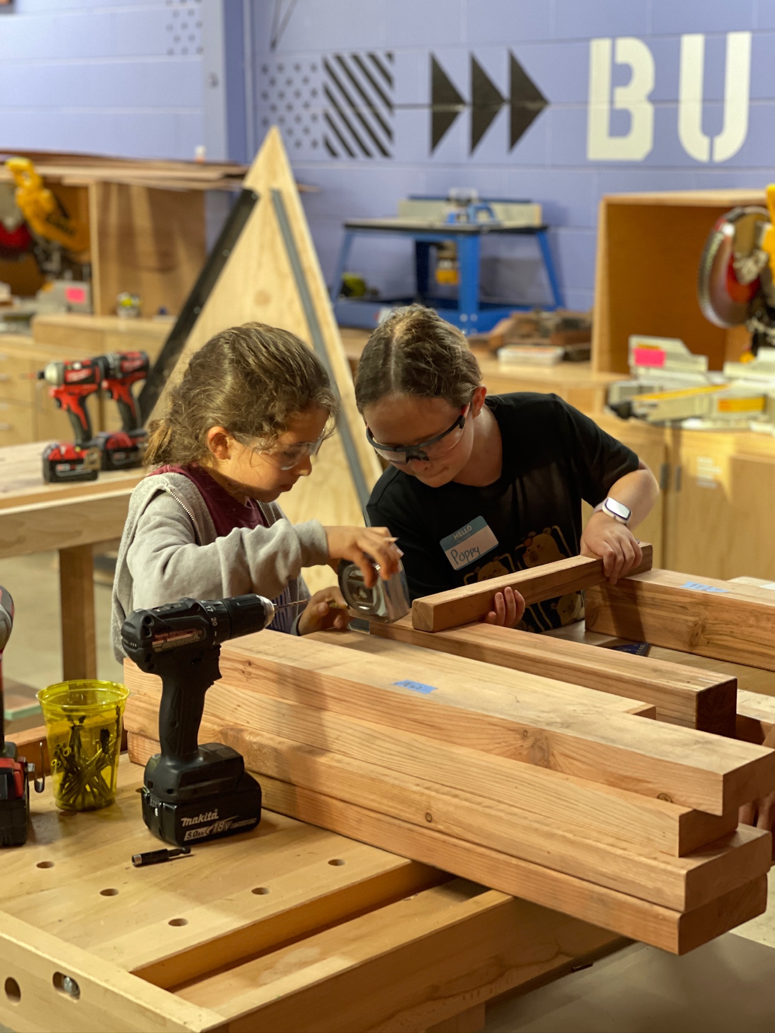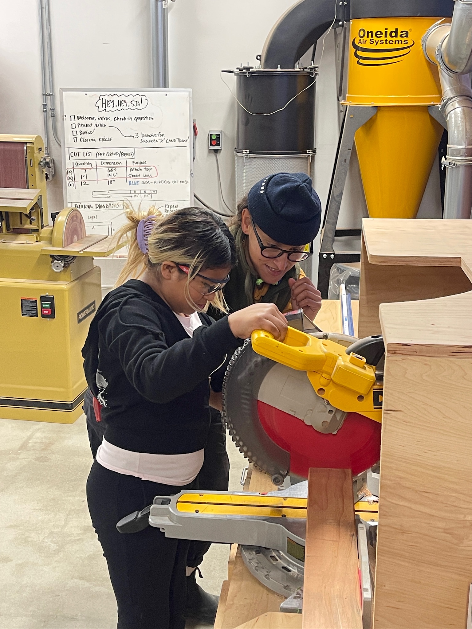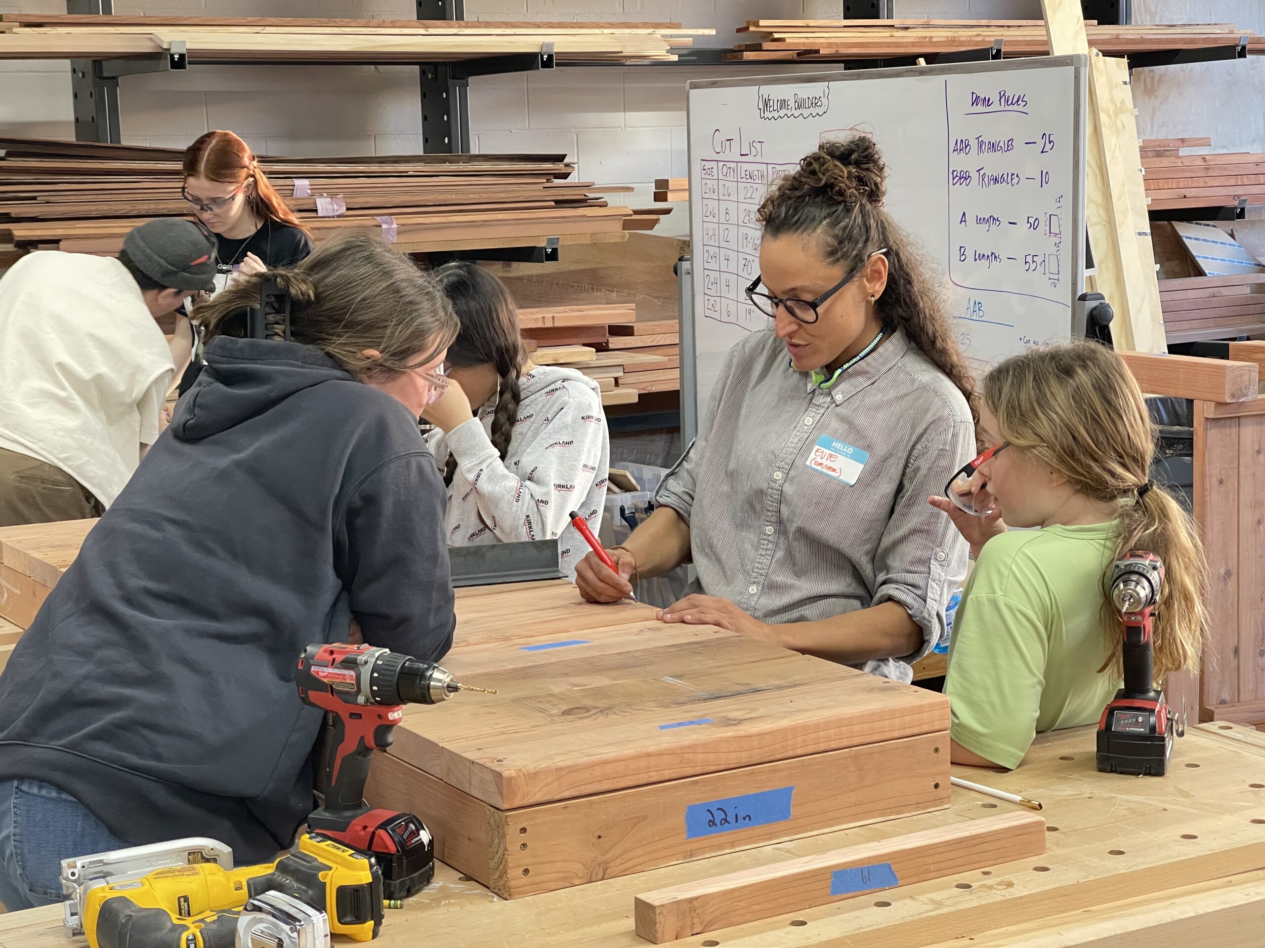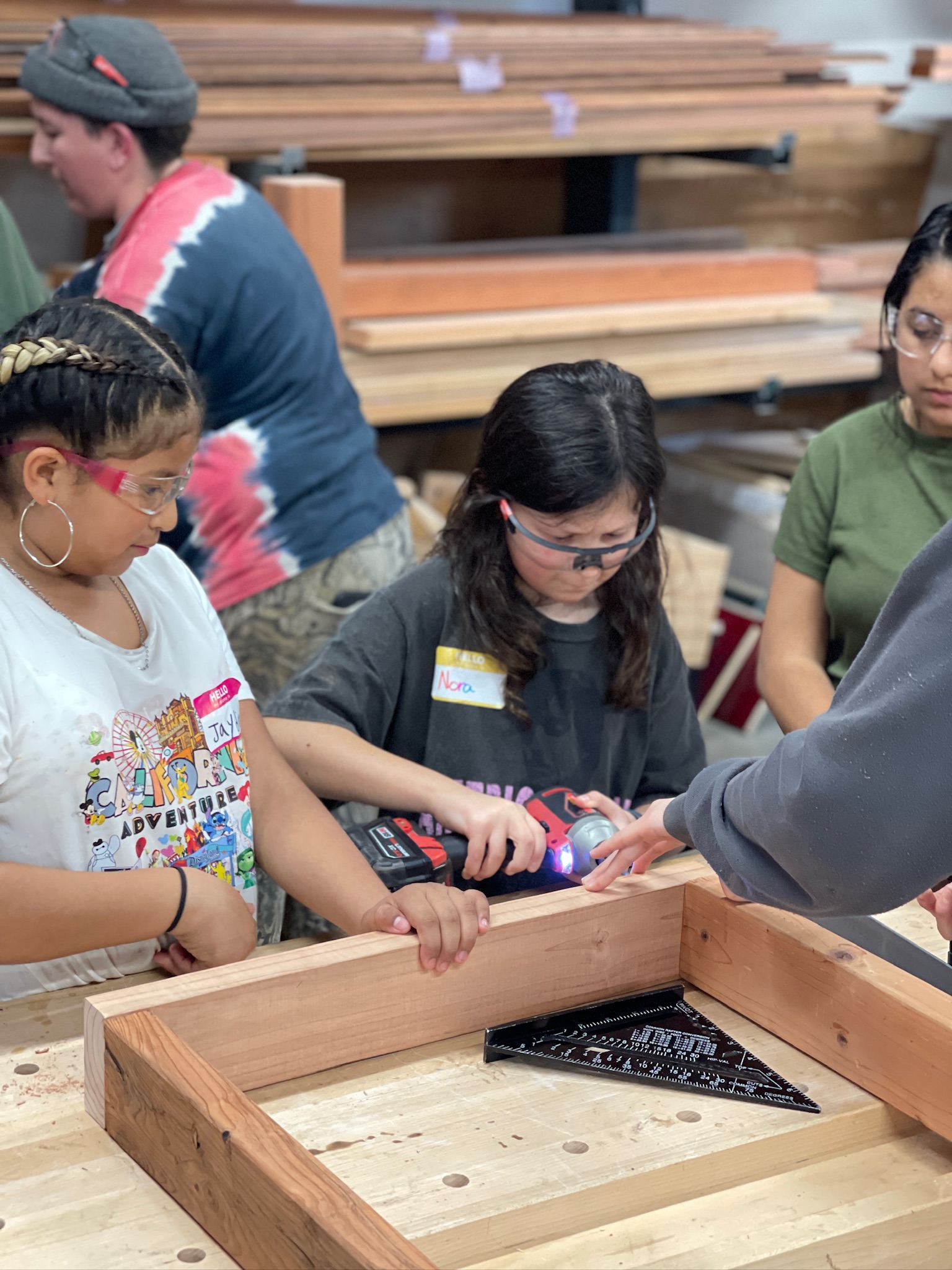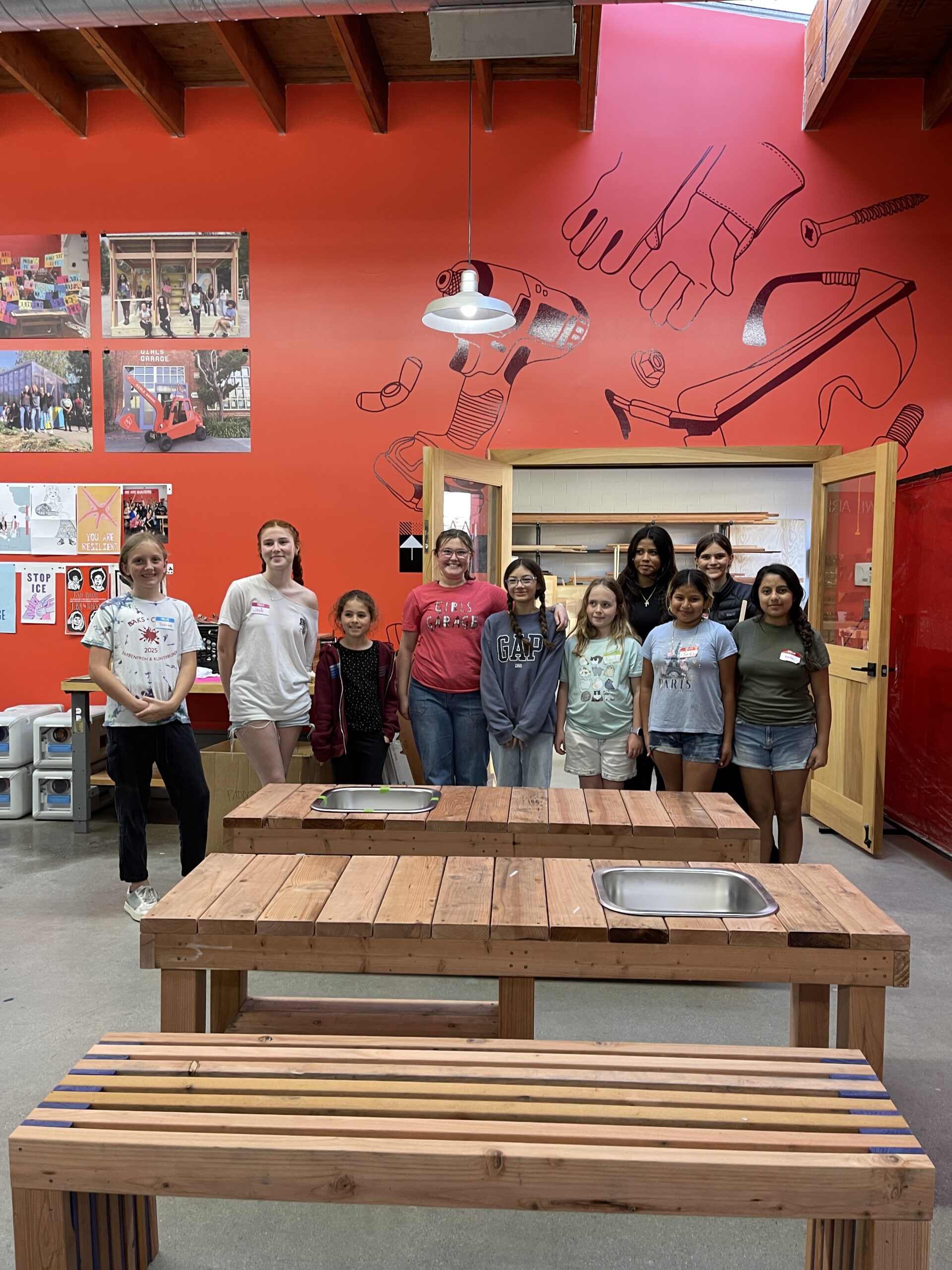 Our most beginner builders set out to construct two mud kitchens for East Bay Children & Nature in just four short weeks. Not sure what a mud kitchen is? These pieces are outdoor, child-sized play kitchens designed for sensory and imaginative play using natural materials like mud, water, sand, leaves, and sticks. Because these mud kitchens required several pieces of lumber of different sizes cut at different lengths, students had to pay particular attention to the measuring and chop saw demos to ensure accuracy. Getting those pesky stainless steel sinks secured proved more difficult than anticipated! Patty, executive director of East Bay Children & Nature, even joined and built alongside the students so she could take the skills she learned to build more mud kitchens and other projects for their organization. On our last day together, students reflected on the building process and declared their love for their new favorite tools, like the chop saw, drill, and jigsaw. In addition to the two mud kitchens, students had the time to construct a bench for another community partner. Talk about adept teamwork!